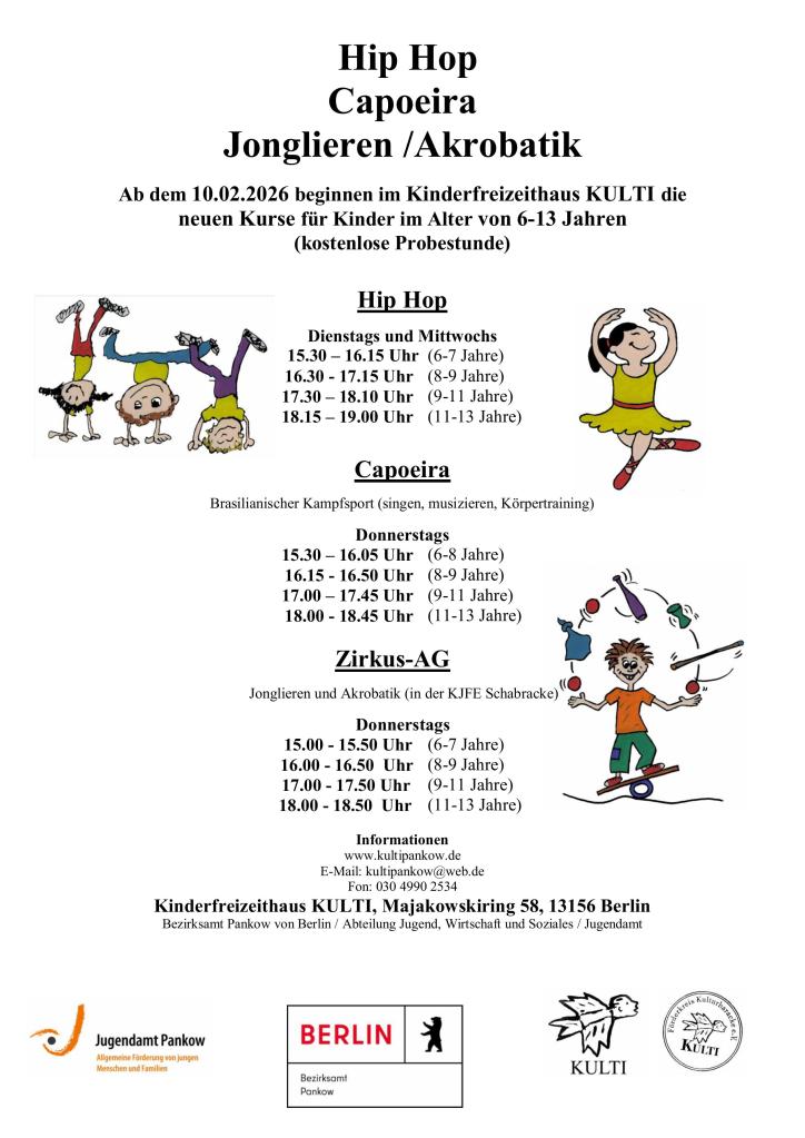 Vor 1 Woche 21. Januar 202626. Januar 2026kultipankow bild Freie Plätze in den Kursen! Teilen mit: Auf X teilen (Wird in neuem Fenster geöffnet) X Auf Facebook teilen (Wird in neuem Fenster geöffnet) Facebook Gefällt mir Wird geladen …