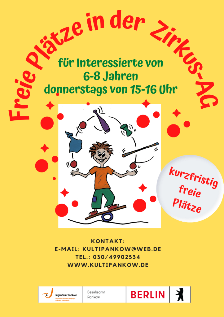 Vor 6 Tagen 29. Januar 202629. Januar 2026kultipankow bild Freie Plätze in der Zirkus-AG Teilen mit: Auf X teilen (Wird in neuem Fenster geöffnet) X Auf Facebook teilen (Wird in neuem Fenster geöffnet) Facebook Gefällt mir Wird geladen …