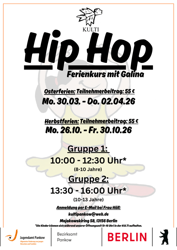 vor 2 Stunden 25. Februar 202625. Februar 2026kultipankow bild Freie Plätze im HipHop Ferienworkshop Teilen mit: Auf X teilen (Wird in neuem Fenster geöffnet) X Auf Facebook teilen (Wird in neuem Fenster geöffnet) Facebook Gefällt mir Wird geladen …